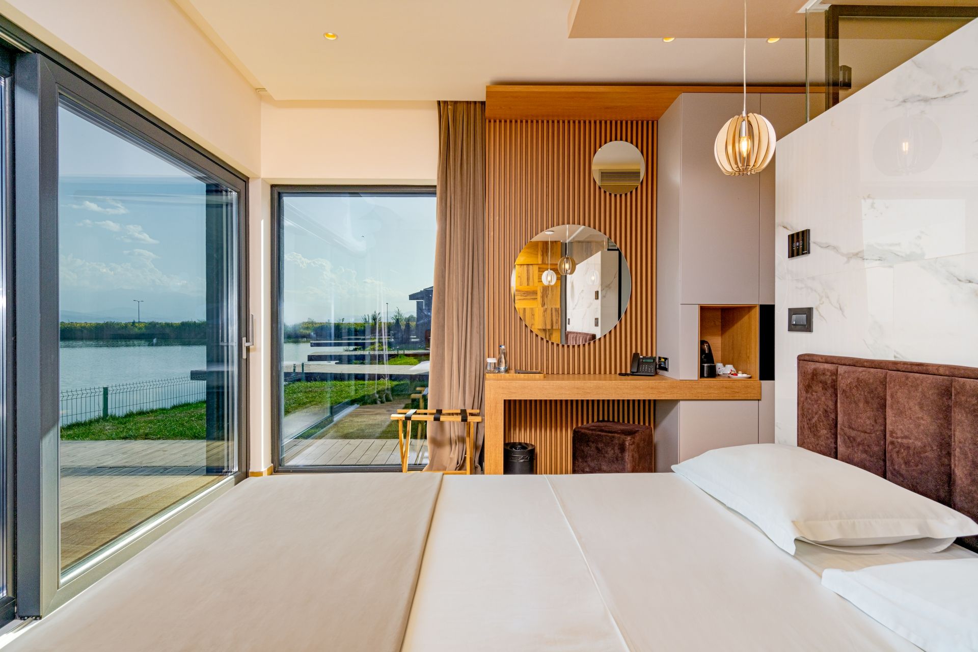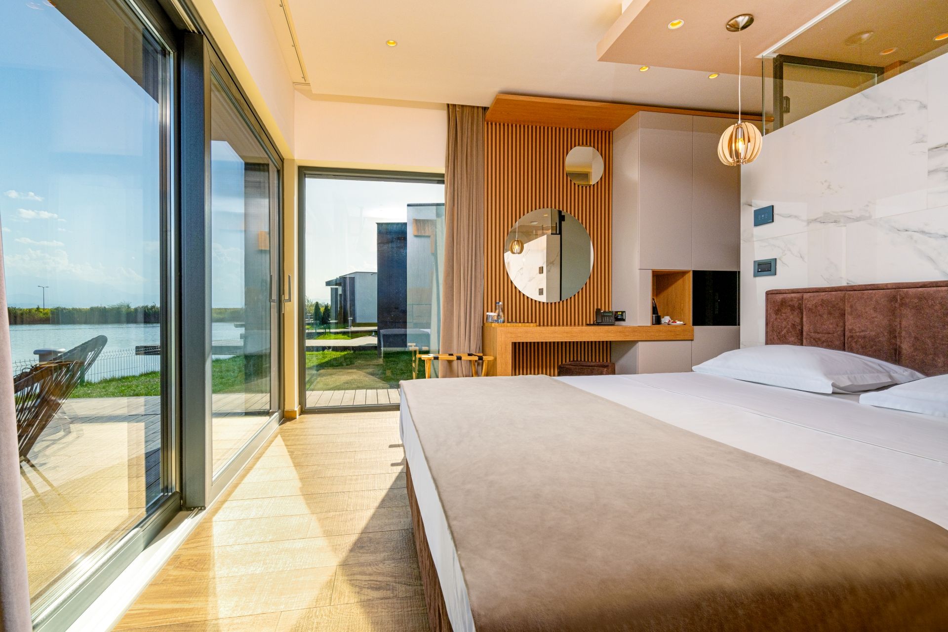Cameră cu ponton și vedere spre lac și munți;