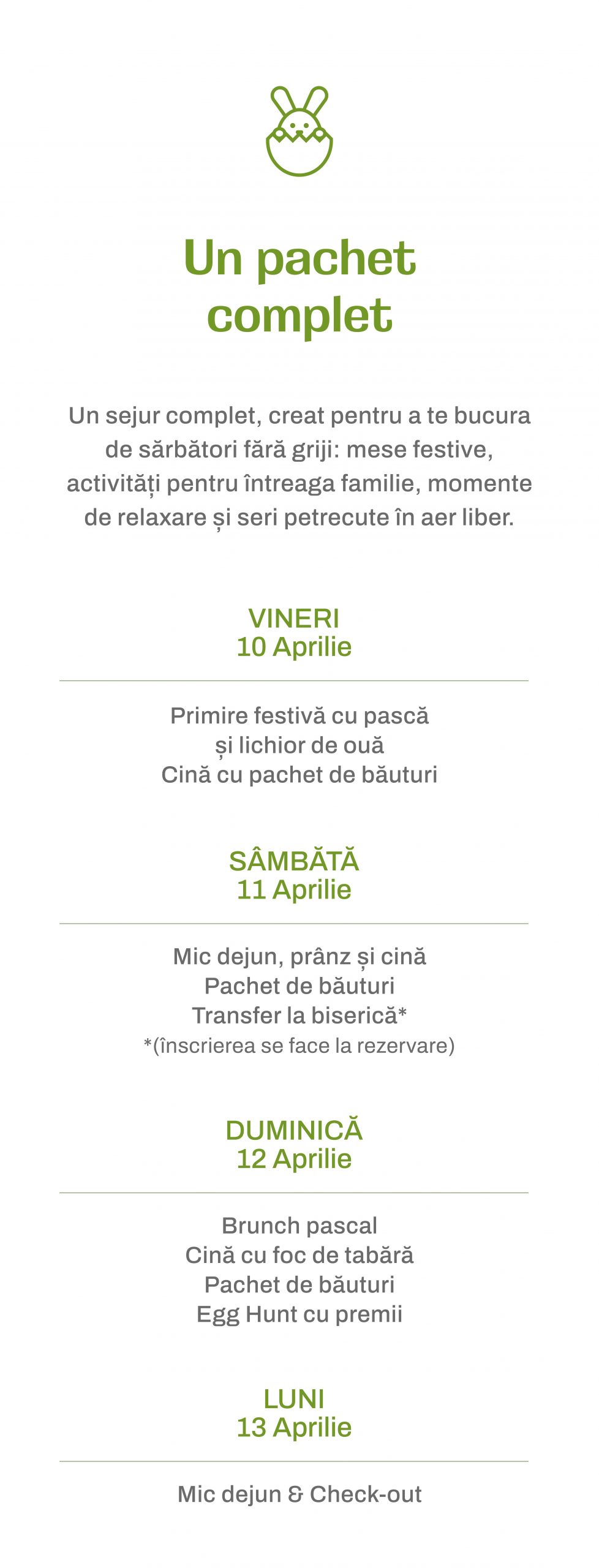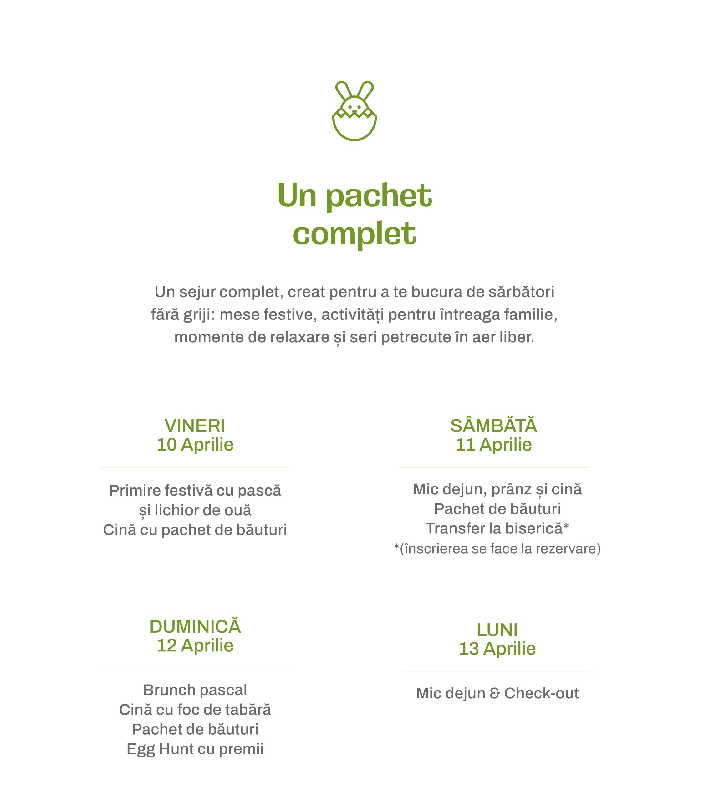 Paștele este despre timp petrecut împreună, mese așezate și liniștea care vine atunci când te bucuri de prezent. Te așteaptă un sejur în care tradițiile românești se împletesc cu confortul, natura și bucuria momentelor simple.