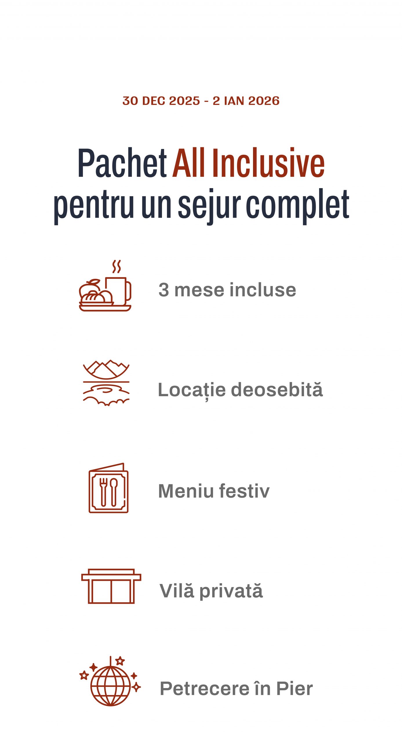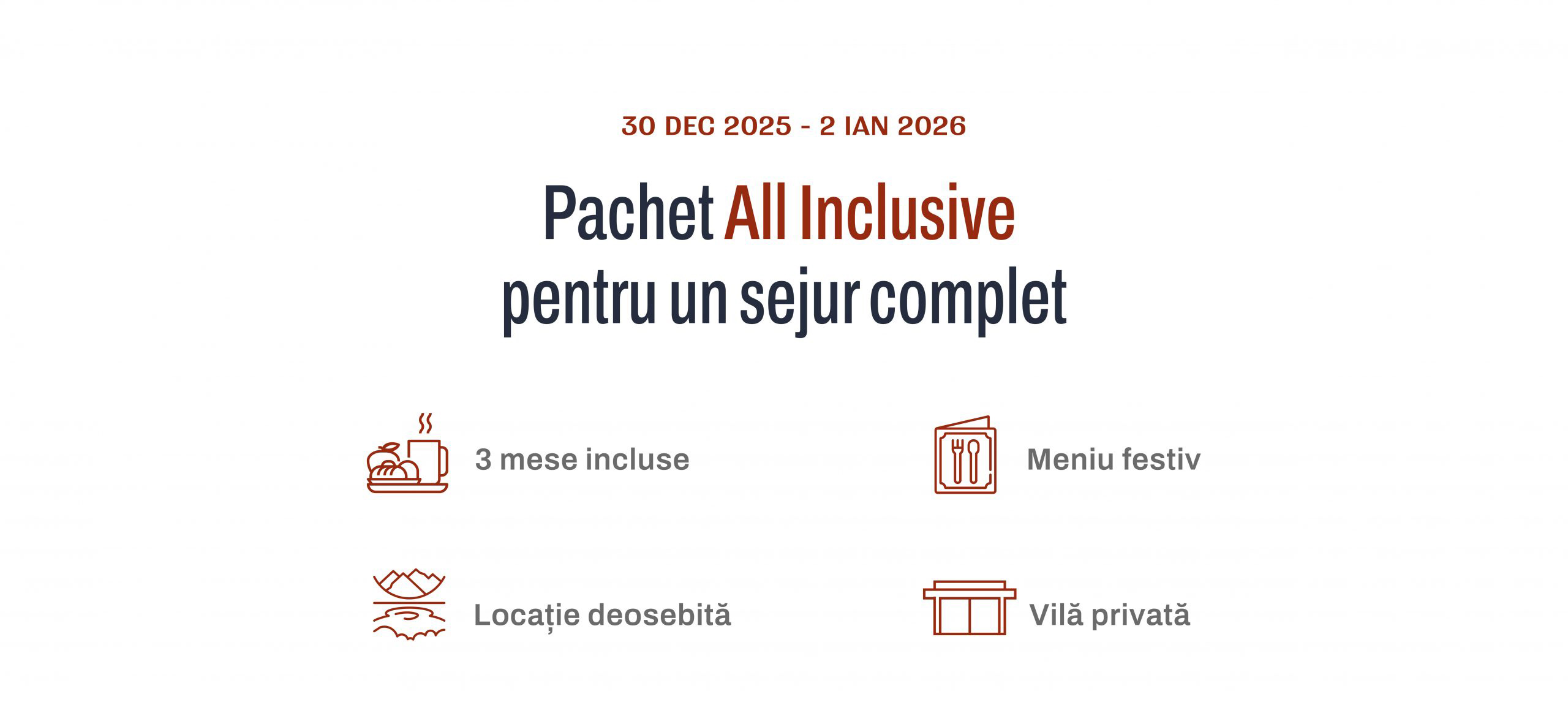 3 nopți de relaxare în vilele Serenity, mese incluse, peisaje liniștitoare și o atmosferă festivă completă. Lasă grijile acasă și întâmpină noul an cu tihnă.